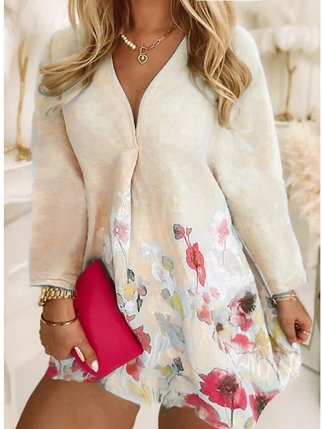Women‘s Plus Size Curve Apple Shaped Dress Casual Dress Floral V Neck Print Long Sleeve Winter Fall Stylish Casual Mini Dress Daily Vacation Dress Weekend