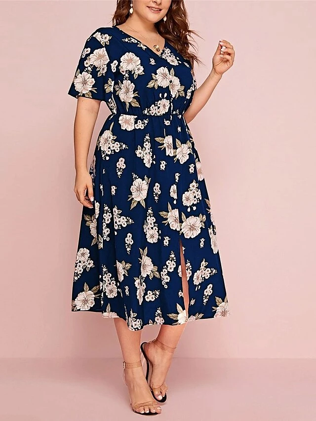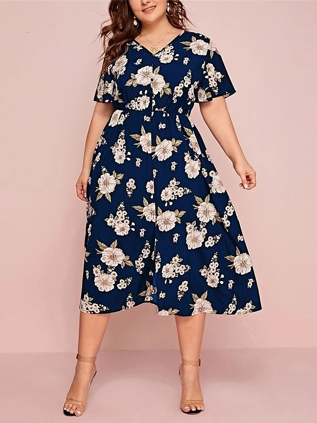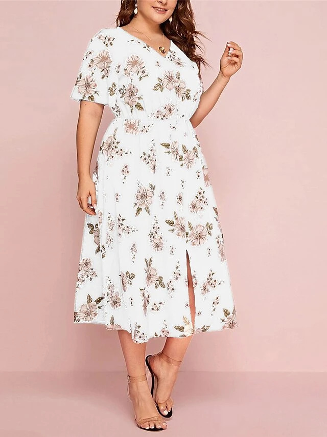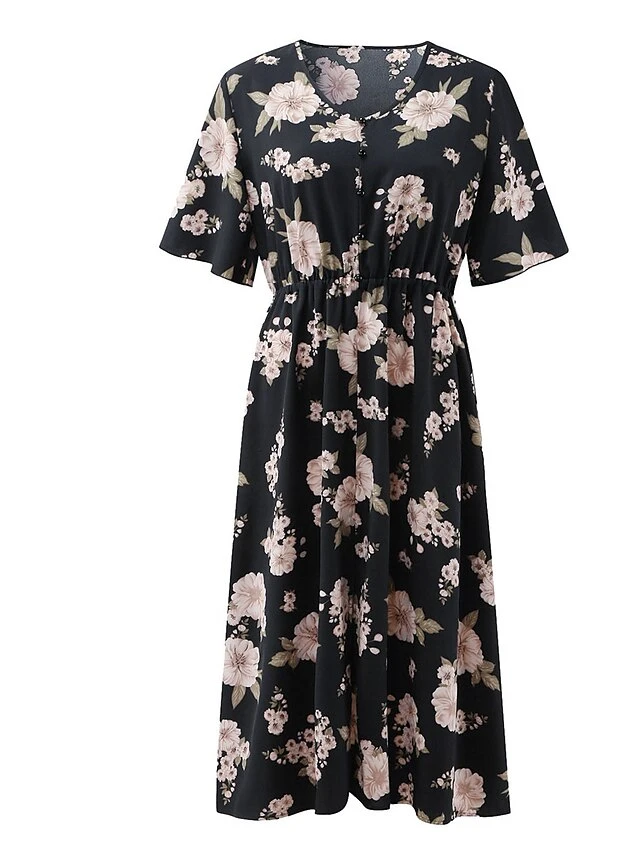 Women‘s Plus Size Curve Casual Dress A Line Dress Floral Dress Floral Midi Dress Short Sleeve Print V Neck Fashion Daily Black White Spring Summer L XL XXL 3XL