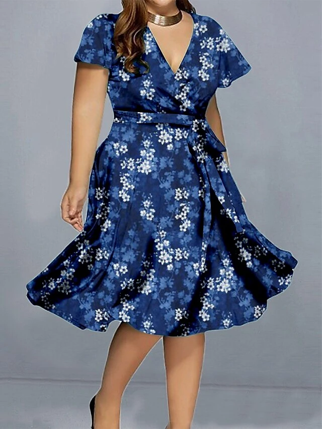 Women‘s Plus Size Curve Casual Dress A Line Dress Floral Midi Dress Short Sleeve Print V Neck Elegant Daily Black White Summer Spring L XL XXL 3XL 4XL
