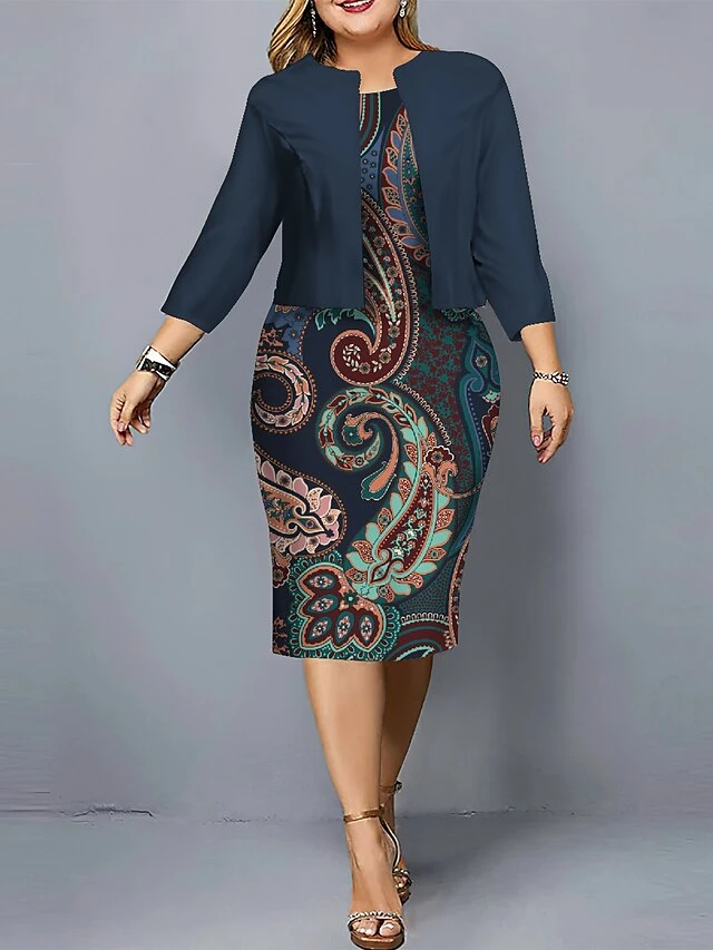 Women’s Plus Size Curve Casual Dress Dress Set Two Piece Dress Floral Geometric Midi Dress Long Sleeve Print Crew Neck Fashion Outdoor Pink Navy Blue Fall Winter L XL XXL 3XL 4XL