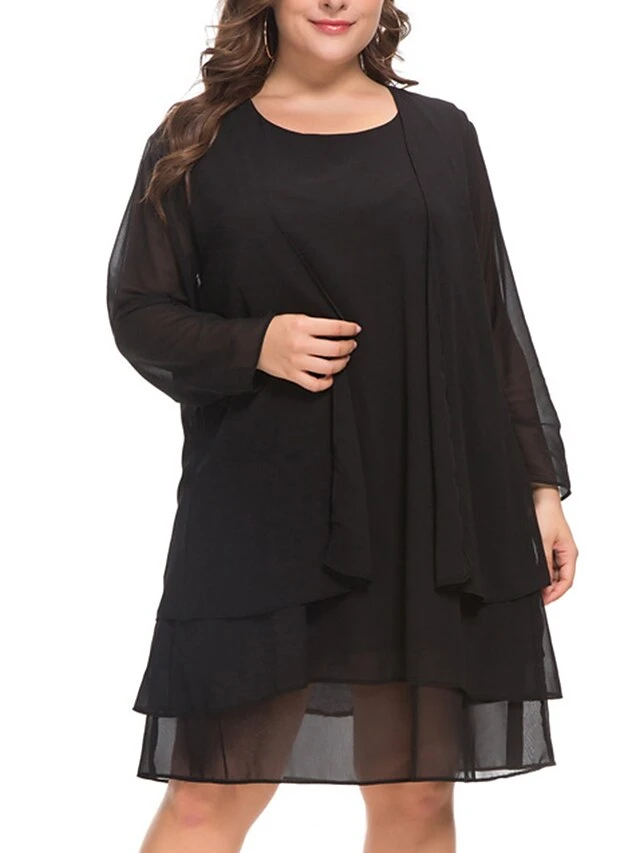 Women‘s Plus Size Curve Casual Dress Solid Color Crew Neck Mesh Long Sleeve Spring Fall Casual Knee Length Dress Daily Vacation Dress