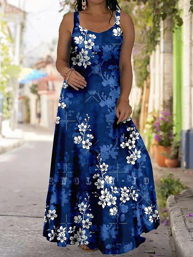 Women‘s Plus Size Curve Casual Dress Strap Dress Floral Long Dress Maxi Dress Sleeveless Print Strap Fashion Outdoor Black White Summer Spring L XL XXL 3XL 4XL