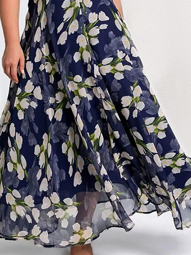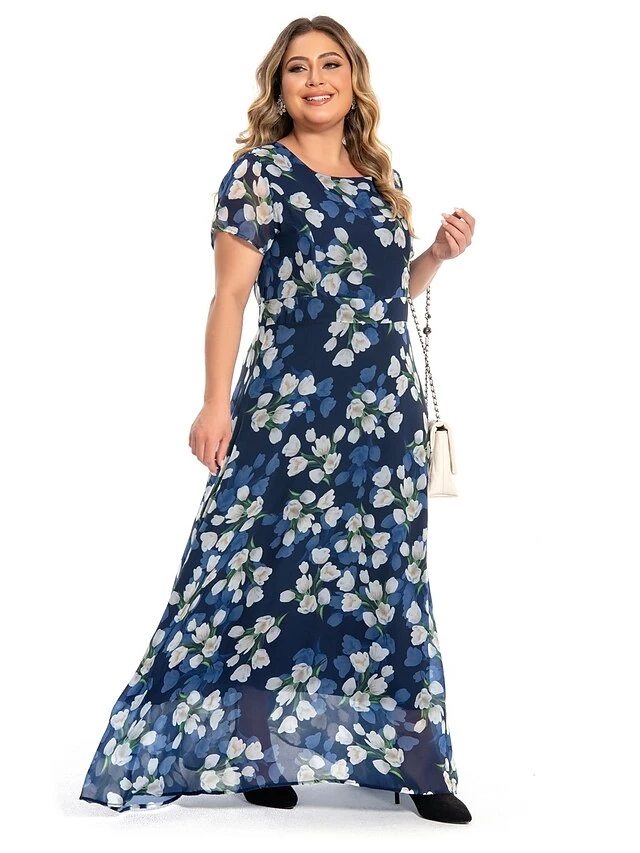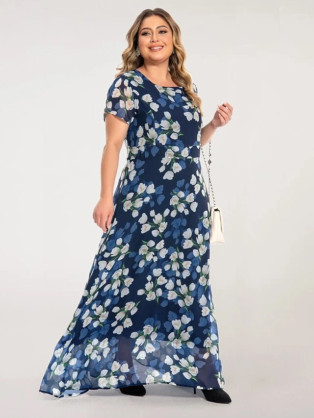 Women‘s Plus Size Curve Casual Dress Swing Dress A Line Dress Floral Long Dress Maxi Dress Short Sleeve Mesh Print Crew Neck Elegant Daily Dark Blue Summer Spring L XL XXL 3XL 4XL