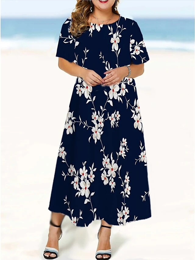 Women‘s Plus Size Curve Casual Dress Swing Dress Floral Long Dress Maxi Dress Short Sleeve Print Crew Neck Fashion Outdoor White Yellow Summer Spring L XL XXL 3XL 4XL