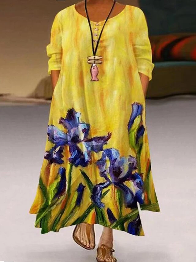 Women’s Plus Size Curve Casual Dress Swing Dress Print Maxi Long Dress Long Sleeve Layered Asymmetric Crew Neck Vintage Daily Light Blue Blue Spring Fall L XL XXL XXXL 4XL