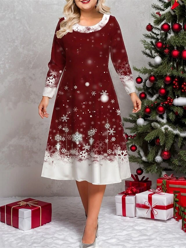 Women’s Plus Size Curve Casual Dress Winter Dress Skater Dress Snowflake Midi Dress Long Sleeve Print Crew Neck Fashion Outdoor White Wine Fall Winter L XL XXL 3XL 4XL
