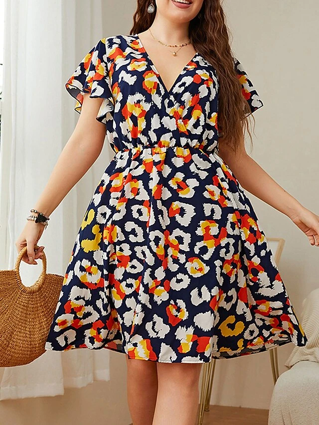 Women‘s Plus Size Curve Casual Sweater Dress Floral Sweater Dress Floral Midi Sweater Dress Short Sleeve Print V Neck Fashion Daily Blue Spring Summer XL XXL 3XL 4XL