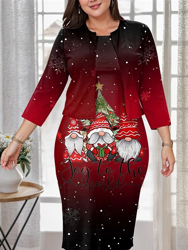Women’s Plus Size Curve Christmas Dress Casual Dress Dress Set Santa Claus Gradient Midi Dress Long Sleeve Print Crew Neck Fashion Outdoor Wine Fall Winter L XL XXL 3XL 4XL