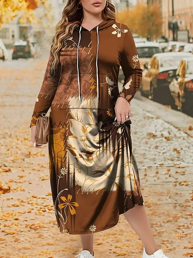 Women’s Plus Size Curve Hoodie Dress Casual Dress Winter Dress Leaf Geometric Long Dress Maxi Dress Long Sleeve Pocket Print Hooded Fashion Outdoor Brown Khaki Fall Winter L XL XXL 3XL 4XL