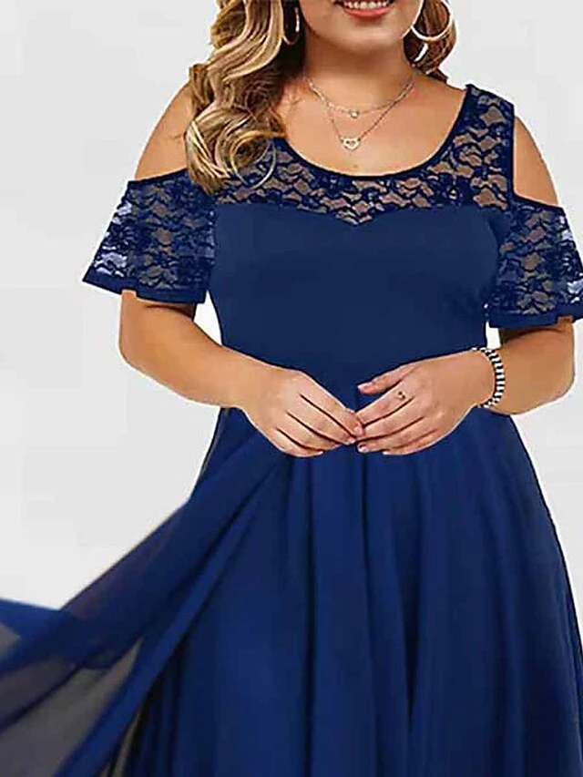 Women‘s Plus Size Curve Party Dress Apple Shape Dress Lace Dress Chiffon Dress Solid Color Long Dress Maxi Dress Half Sleeve Lace Patchwork U Neck Elegant Fashion Party Navy Blue Summer Spring Dress