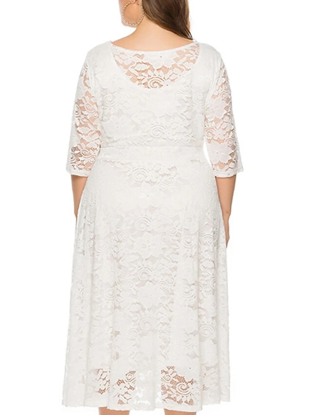 Women‘s Plus Size Curve Party Dress Black Dress Floral Crew Neck Lace 3/4 Length Sleeve Spring Fall Work Prom Dress Midi Dress Party