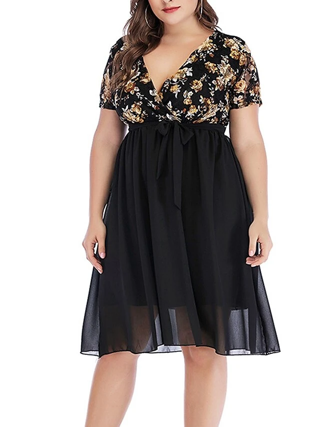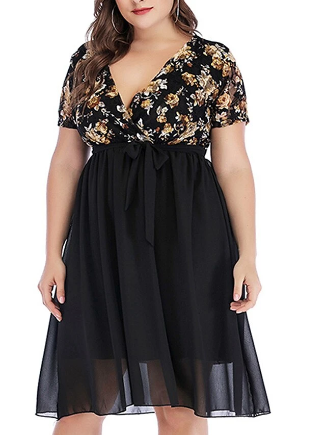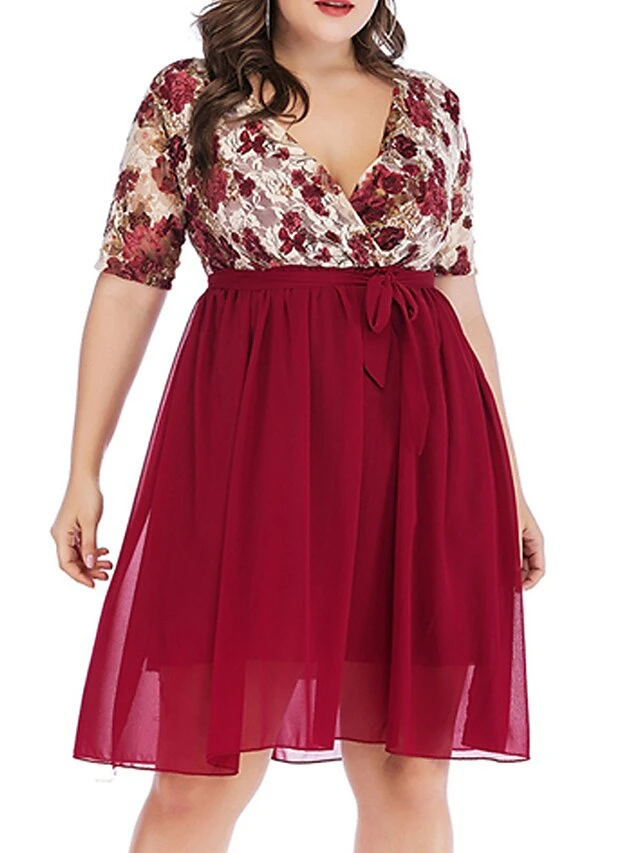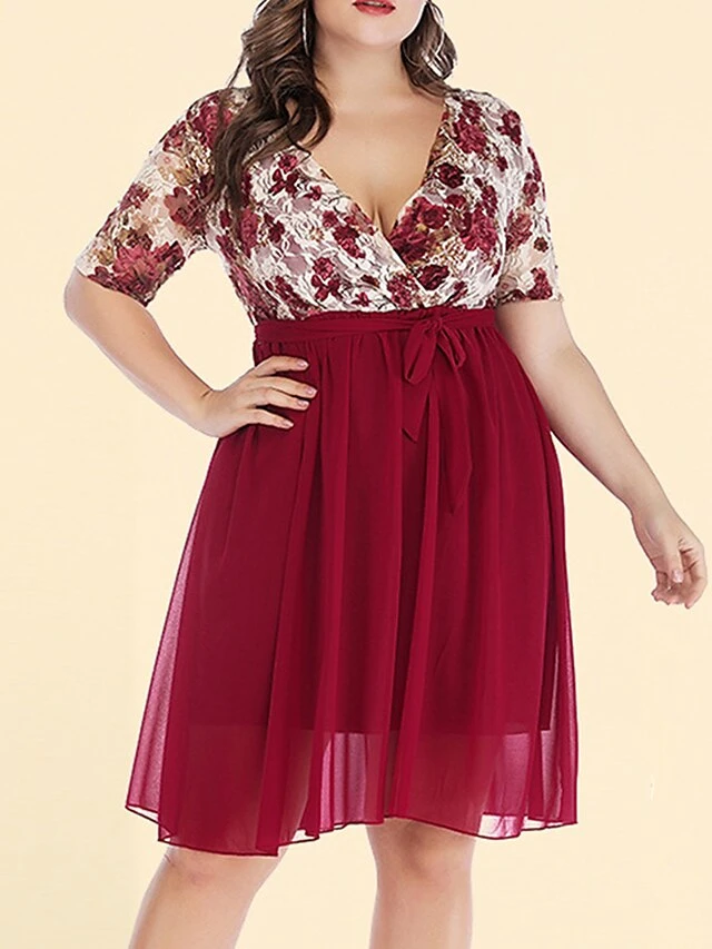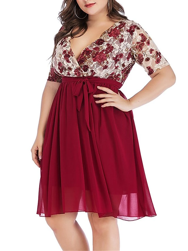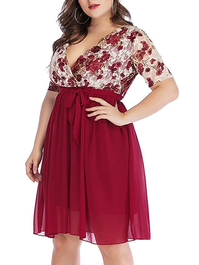 Women‘s Plus Size Curve Party Dress Cocktail Dress Wedding Guest Dress Midi Dress Black Wine Short Sleeve Floral Lace Up Summer Spring Fall V Neck Fashion Birthday Wedding Guest Vacation 2023