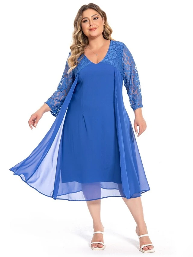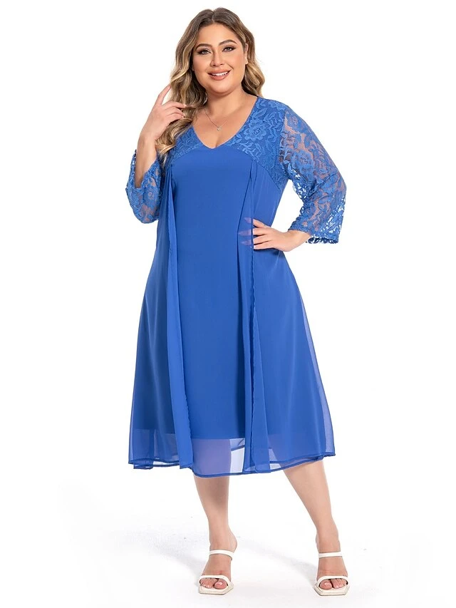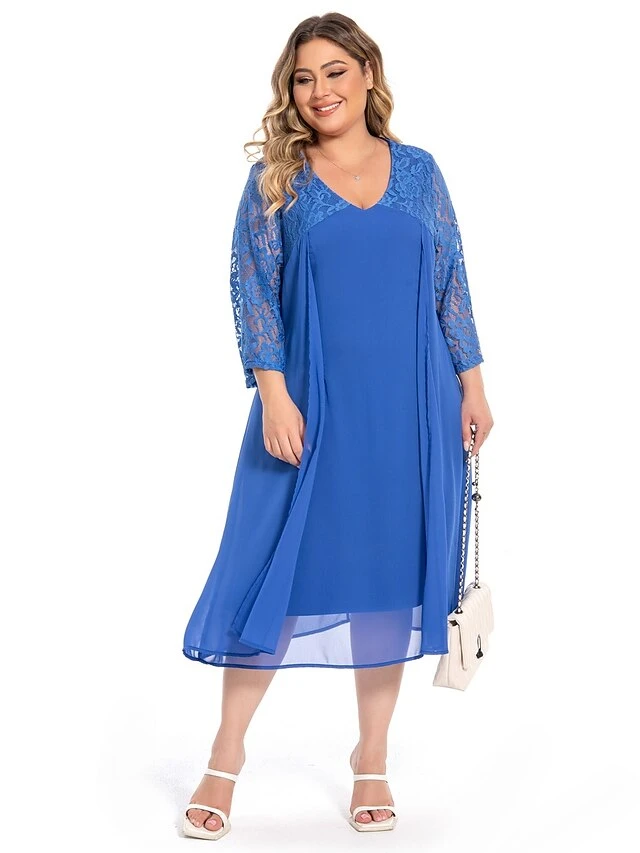 Women‘s Plus Size Curve Party Dress Lace Dress Work Dress Midi Dress Blue 3/4 Length Sleeve Pure Color Lace Summer Spring Fall V Neck Fashion Wedding Guest Summer Dress 2023 L XL XXL 3XL 4XL 5XL