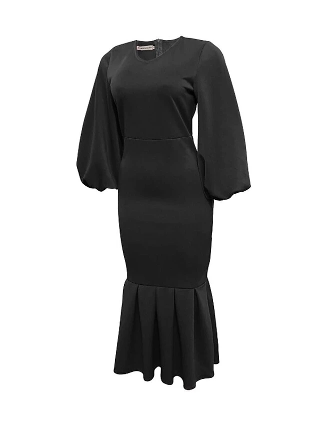Women‘s Plus Size Curve Party Dress Solid Color V Neck Ruched Puff Sleeve Long Sleeve Winter Fall Casual Maxi Long Dress Party Vacation Dress Sheath Dress Black Dress