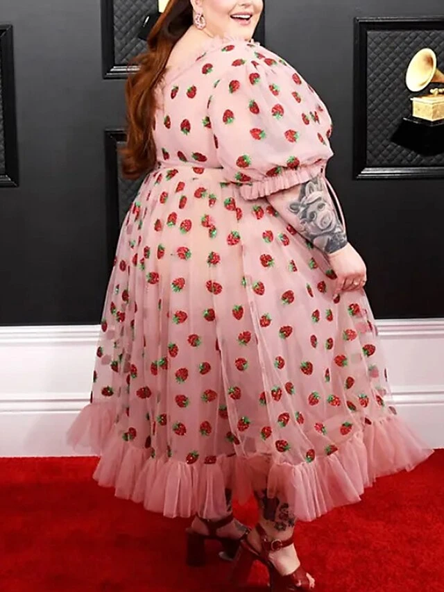 Women‘s Plus Size Curve Party Dress Swing Dress A Line Dress Strawberry Long Dress Maxi Dress Half Sleeve Mesh Patchwork V Neck Fashion Party Pink Spring Summer L XL XXL 3XL 4XL