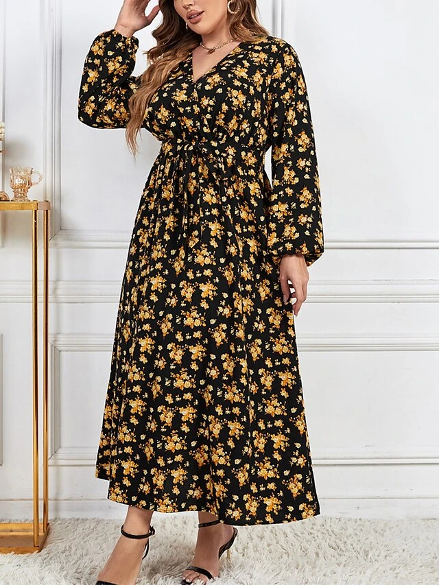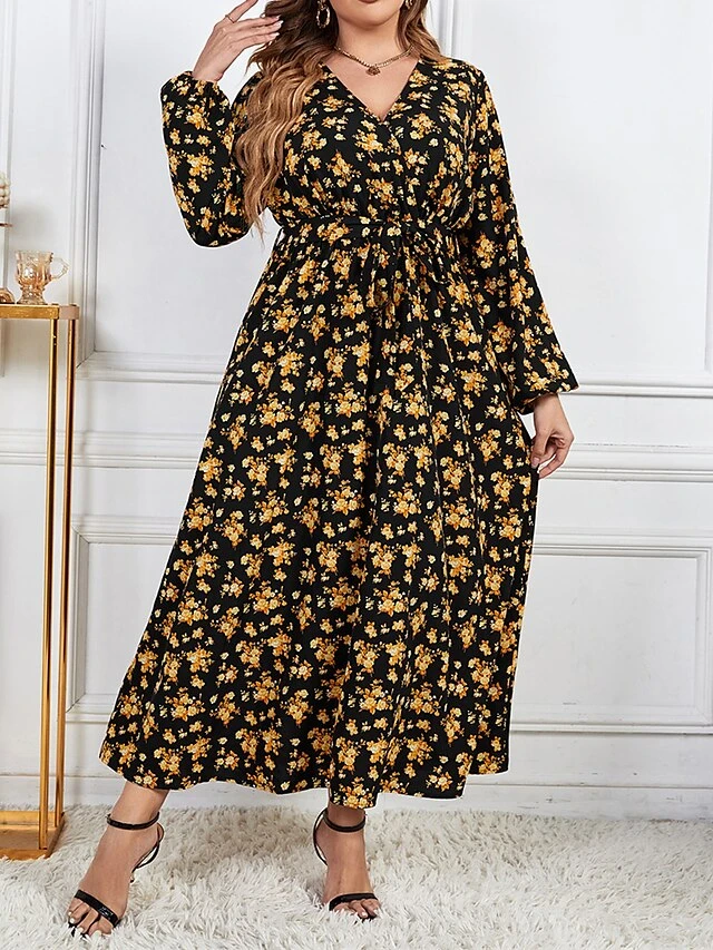 Women’s Plus Size Curve Party Dress Swing Dress Empire Waist Dresses Long Dress Maxi Dress Black Long Sleeve Floral Print Spring Fall Winter V Neck Fashion Winter Dress Birthday Wedding Guest XL XXL