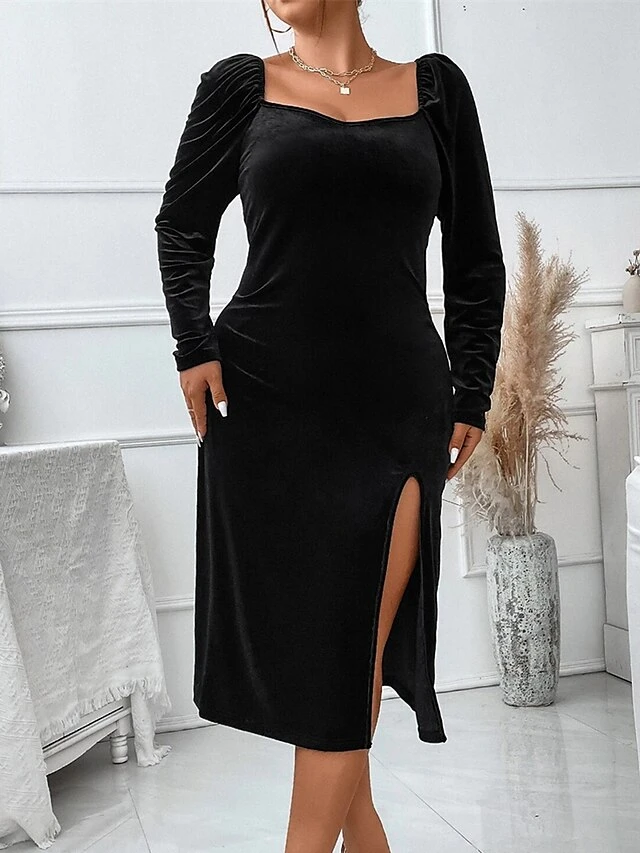 Women‘s Plus Size Curve Party Dress Velvet Dress Cocktail Dress Black Dress Midi Dress Long Sleeve Pure Color Split Spring Fall Winter Square Neck Fashion Birthday Wedding Guest Vacation 2023
