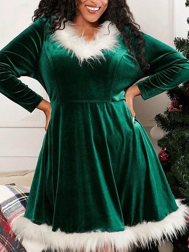 Women’s Plus Size Curve Velvet Dress Casual Dress Winter Dress Solid Color Mini Dress Long Sleeve Patchwork V Neck Fashion Outdoor Green Fall Winter L XL XXL 3XL 4XL