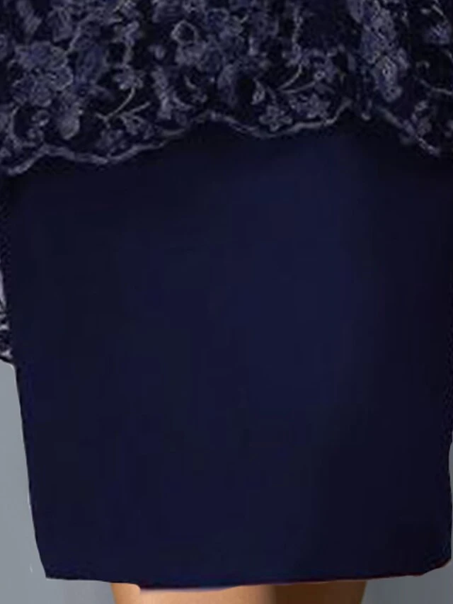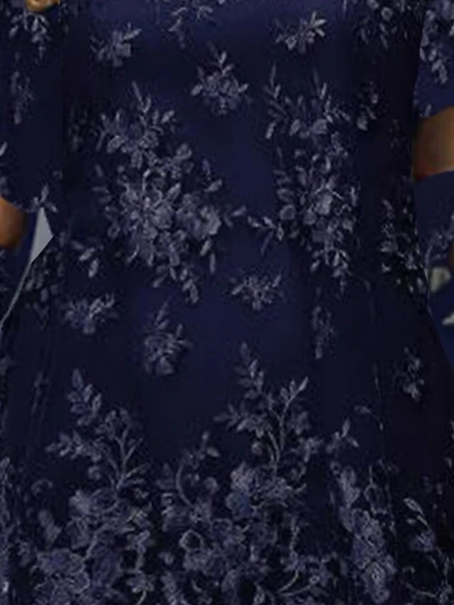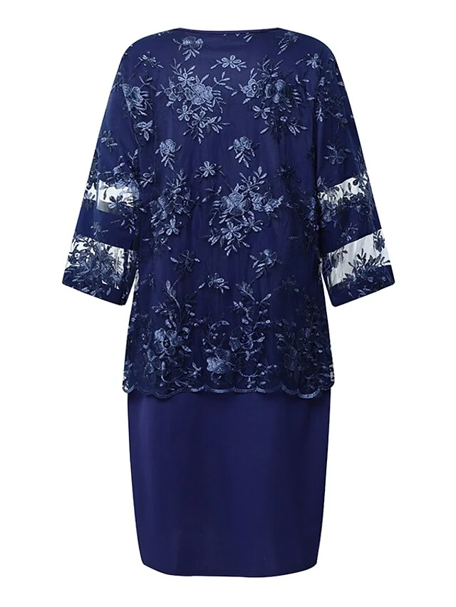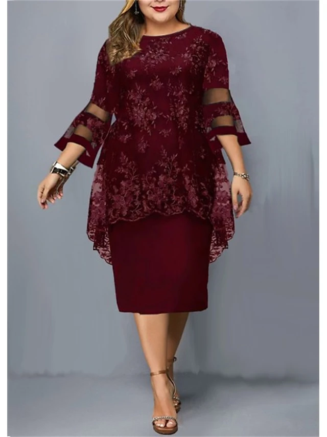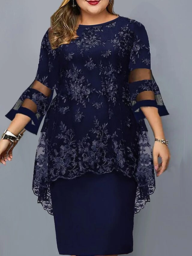 Women’s Plus Size Curve Wedding Guest Dress Lace Party Dress Crew Neck Print 3/4 Length Sleeve Mother Dress Spring Fall Dress Elegant Formal Midi Dress Party Cocktail Dress