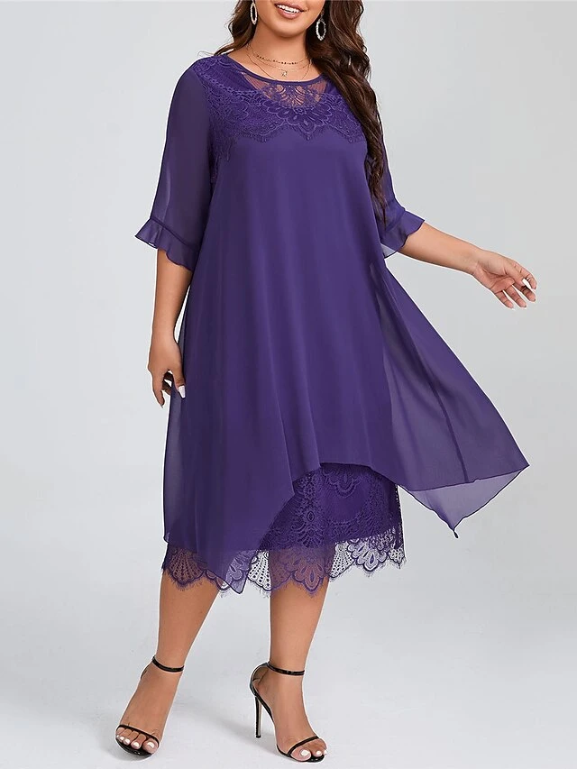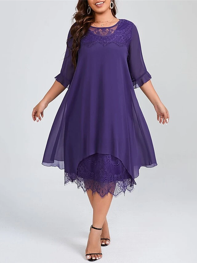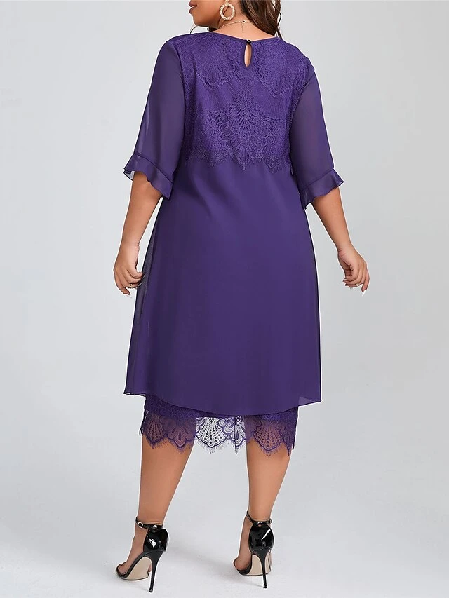 Women’s Plus Size Curve Winter Dress Casual Dress Lace Dress Plain Midi Dress 3/4 Length Sleeve Lace Ruched Crew Neck Fashion Daily Purple Fall Winter L XL XXL 3XL 4XL