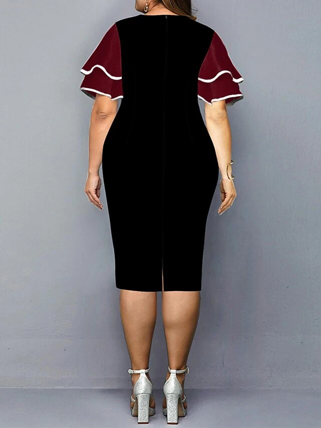 Women‘s Plus Size Curve Work Dress Bodycon Sheath Dress Color Block Midi Dress Half Sleeve Ruffle Crew Neck Fashion Outdoor Wine Red Fall Spring XL XXL 3XL 4XL 5XL