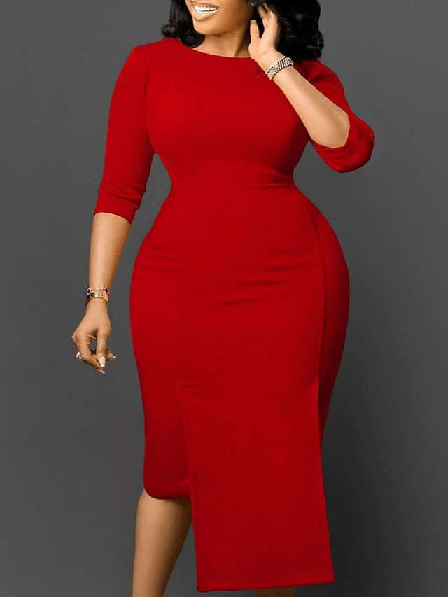 Women‘s Plus Size Curve Work Dress Bodycon Sheath Dress Solid Color Midi Dress 3/4 Length Sleeve Crew Neck Fashion Office White Pink Summer Spring L XL XXL 3XL