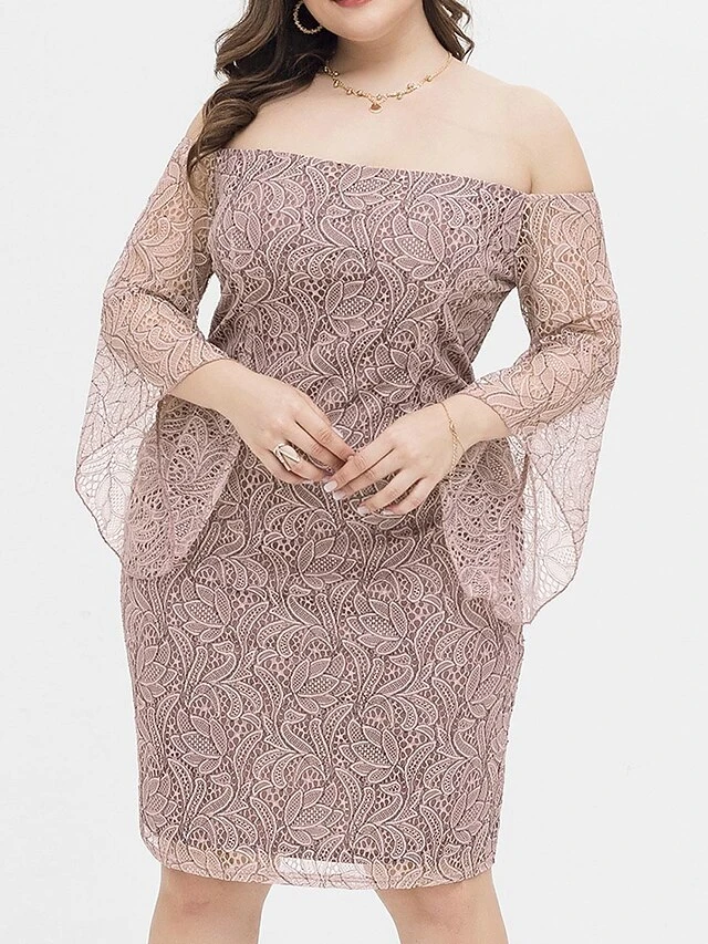 Women’s Plus Size Party Dress Lace Dress Cocktail Dress Midi Dress Pink Long Sleeve Pure Color Lace Spring Fall Winter Off Shoulder Fashion Birthday Wedding Guest Vacation 2023 XL XXL 3XL 4XL