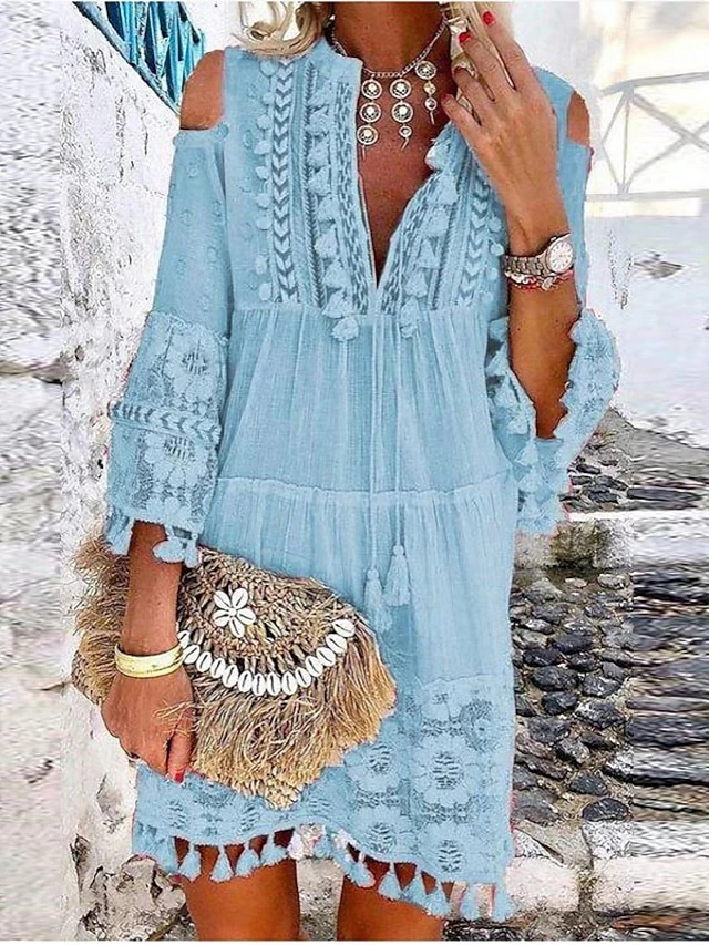 Women’s Shift Dress Boho Dress Mini Dress White Yellow Pink 3/4 Length Sleeve Pure Color Tassel Fringe Summer Spring V Neck Vacation Loose Fit 2023 S M L XL XXL 3XL 4XL 5XL