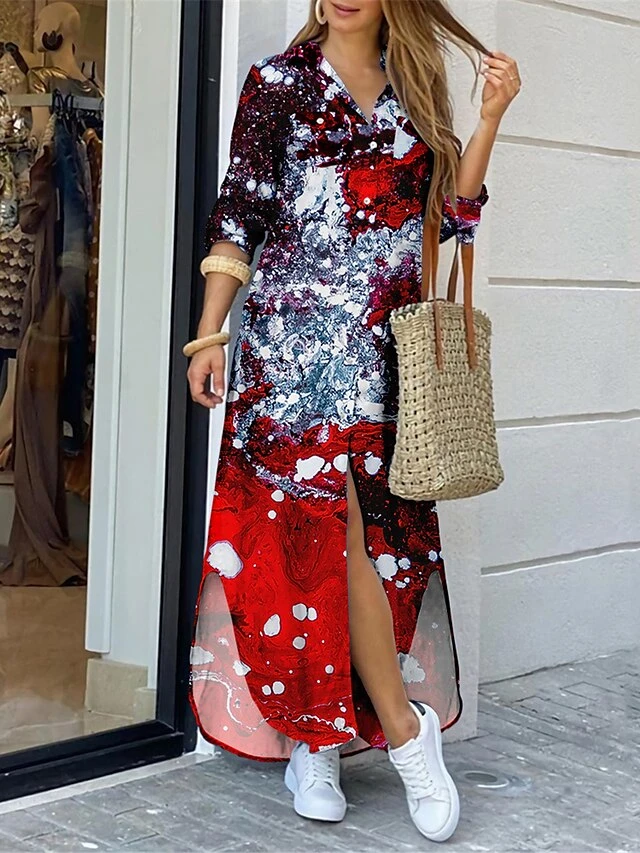 Women’s Shirt Dress Casual Dress Maxi Long Dress Outdoor Daily Polyester Fashion Modern Shirt Collar Button Split Long Sleeve Summer Spring Fall 2023 Regular Fit White Wine Red Abstract S M L XL XXL