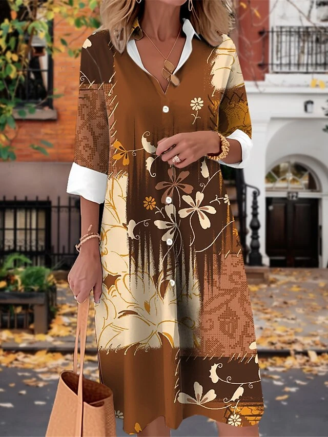 Women’s Shirt Dress Casual Dress Midi Dress Outdoor Daily Date Polyester Fashion Modern Shirt Collar Button Pocket Long Sleeve Fall Winter 2023 Loose Fit Brown Khaki Gray Leaf Floral Geometric S M L