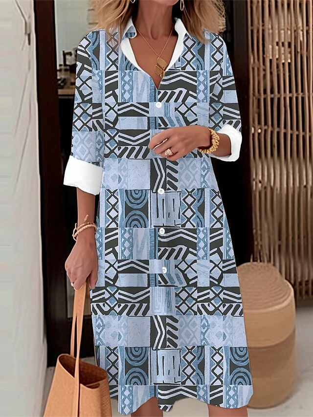 Women’s Shirt Dress Casual Dress Midi Dress Outdoor Daily Date Polyester Fashion Modern Shirt Collar Button Pocket Long Sleeve Fall Winter 2023 Loose Fit Royal Blue Blue Green Geometric Plaid Tribal