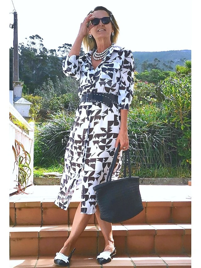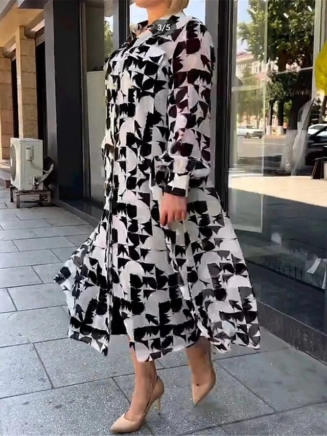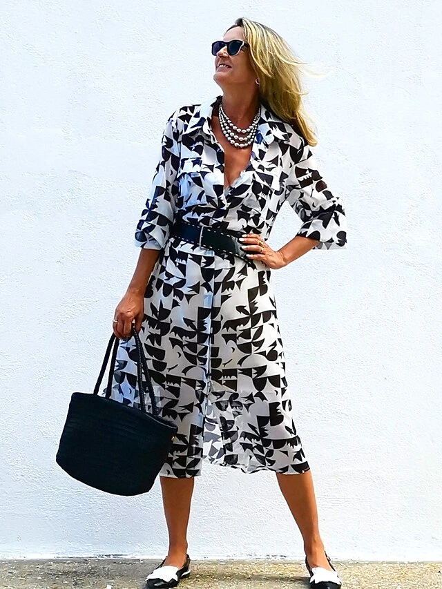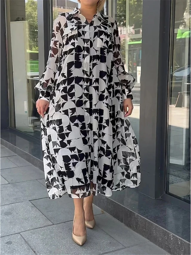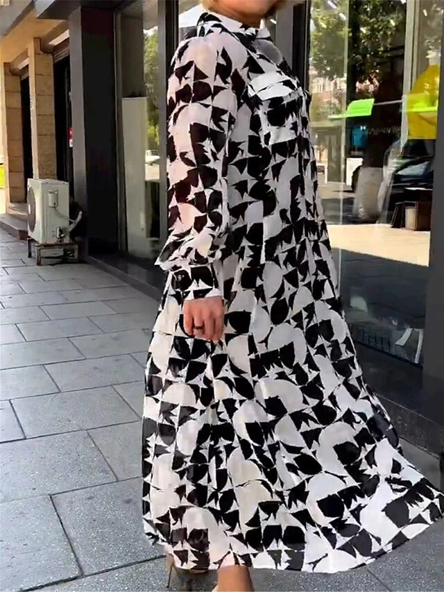 Women’s Shirt Dress Casual Dress Midi Dress Outdoor Daily Vacation Polyester Fashion Modern Shirt Collar Button Pocket Long Sleeve Summer Spring Fall 2023 Loose Fit Black Geometric Color Block S M L