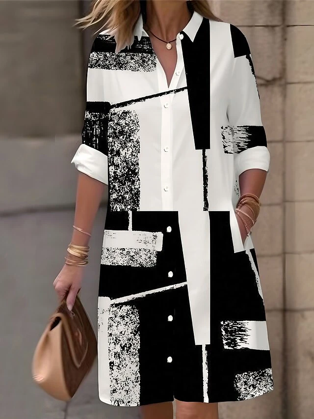 Women’s Shirt Dress Casual Dress Midi Dress Outdoor Office Daily Polyester Fashion Modern Shirt Collar Button Pocket Long Sleeve Fall Winter 2023 Loose Fit Black Geometric Plaid Color Block S M L XL