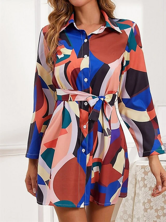 Women’s Shirt Dress Casual Dress Mini Dress Outdoor Daily Vacation Polyester Casual Shirt Collar Lace Up Button Long Sleeve Fall Winter 2023 Loose Fit Blue Flower S M L XL 2XL