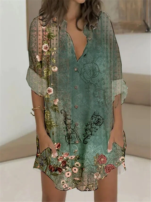 Women’s Shirt Dress Casual Dress Shift Dress Mini Dress Outdoor Daily Vacation Polyester Fashion Casual Stand Collar Button Pocket Long Sleeve Summer Spring Fall 2023 Regular Fit Red Blue Green Floral