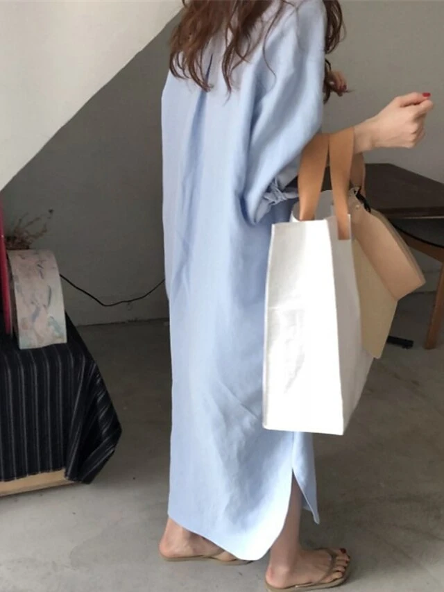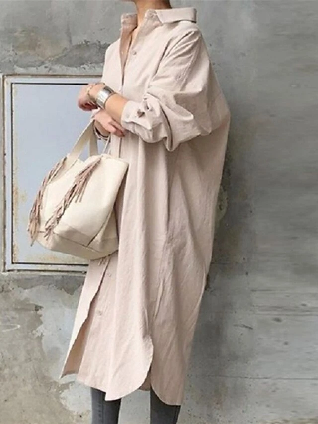Women’s Shirt Dress Maxi Long Dress Winter Dress Daily Vacation Cotton Casual Shirt Collar Button Long Sleeve Summer Spring Fall 2022 Loose Fit White Blue Khaki Pure Color S M L XL