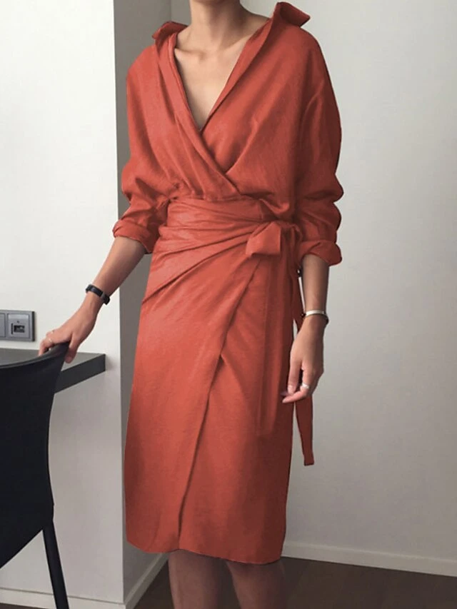 Women’s Shirt Dress Wrap Dress Midi Dress Brown Dark Blue Beige Long Sleeve Pure Color Lace Summer Spring Deep V Elegant Winter Dress Fall Dress Loose Fit 2023 S M L XL