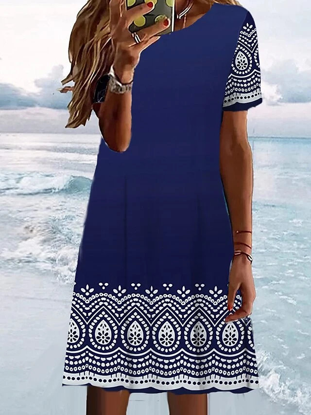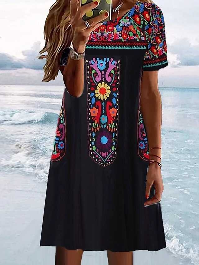 Women’s T Shirt Dress Casual Dress Ethnic Dress Graphic Floral Print Crew Neck Mini Dress Fashion Ethnic Daily Holiday Short Sleeve Regular Fit Light Pink Black Dark Blue Summer Spring S M L XL XXL